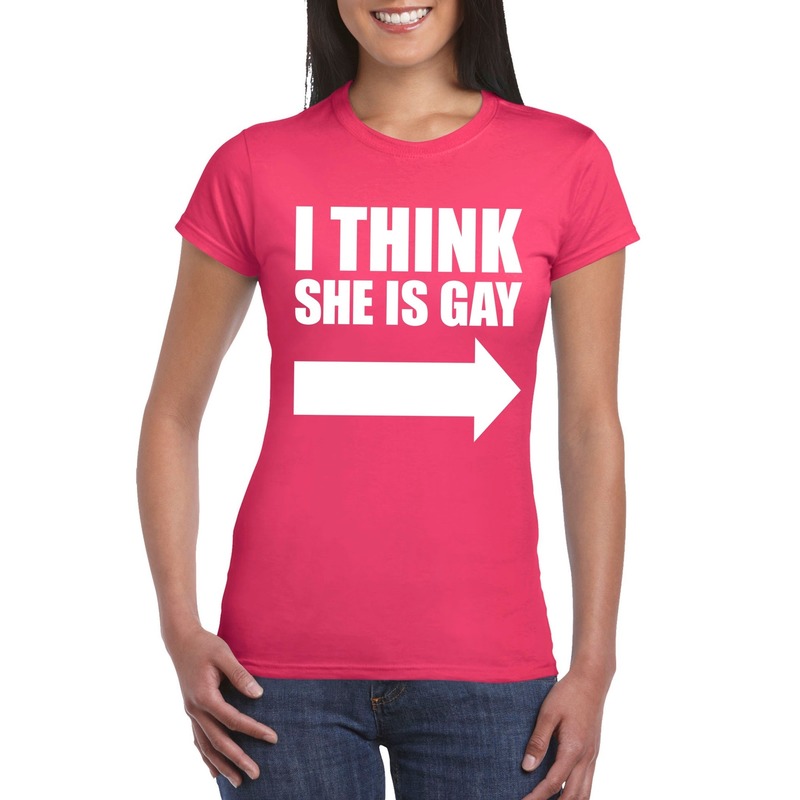 Roze ik denk dat zij homo is t-shirt voor dames. Op dit shirt staat de tekst: I think she is gay en een pijl. Materiaal: 150 grams, 100% katoen.