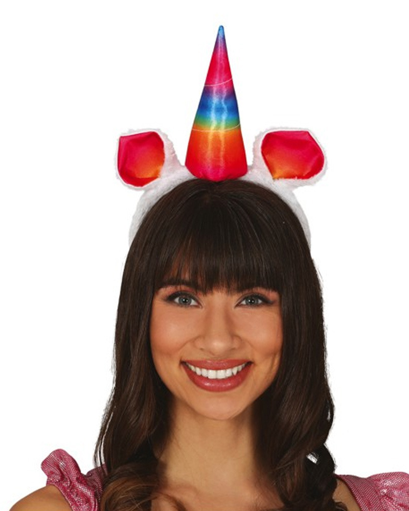 Verkleed haarband van een Eenhoorn/unicorn in regenboog multi kleuren. De hoofdband is one size/maat. Leuk met veel details. Geschikt voor meisjes en dames. Materiaal: polyester. Carnaval party thema verkleed accessoires. Geschikt voor verkleed thema’s zoals: Gay pride, Mystiek dieren, Fantasy, of wat je zelf bedenkt.